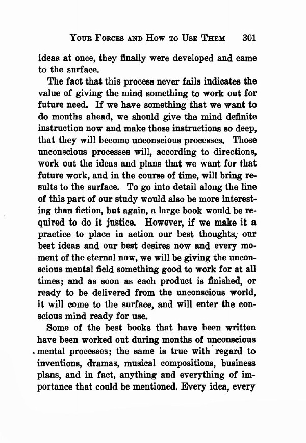 The fact that this process never fails indicates the value of giving the mind something to work out for future need. If we have something that we want to do months ahead, we should give the mind definite instruction now and make those instructions so deep, that they will become unconscious processes. Those unconscious processes will, according to directions, work out the ideas and plans that we want for that future work, and in the course of time, will bring results to the surface. To go into detail along the line of this part of our study would also be more interesting than fiction, but again, a large book would be required to do it justice. However, if we make it a practice to place in action our best thoughts, our best ideas and our best desires now and every moment of the eternal now, we will be giving the unconscious mental field something good to work for at all times; and as soon as each product is finished, or ready to be delivered from the unconscious world, it will come to the surface, and will enter the conscious mind ready for use.