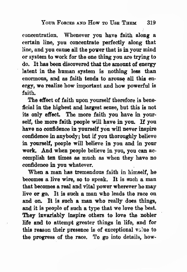 concentration. Whenever you have faith along a certain line, you concentrate perfectly along that line, and you cause all the power that is in your mind or system to work for the one thing you are trying to do. It has been discovered that the amount of energy latent in the human system is nothing less than enormous, and as faith tends to arouse all this energy, we realize how important and how powerful is faith.