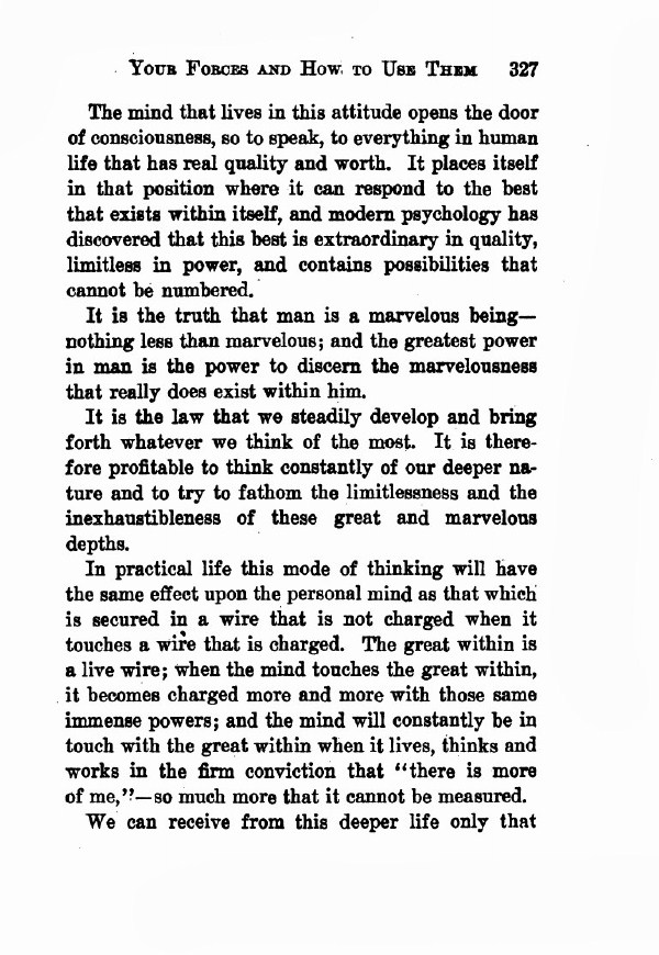 In practical life this mode of thinking will have the same effect upon the personal mind as that which is secured in a wire that is not charged when it touches a wire that is charged. The great within is a live wire; when the mind touches the great within, it becomes charged more and more with those same immense powers; and the mind will constantly be in touch with the great within when it lives, thinks and works in the firm conviction that "there is more of me," -- so much more that it cannot be measured.