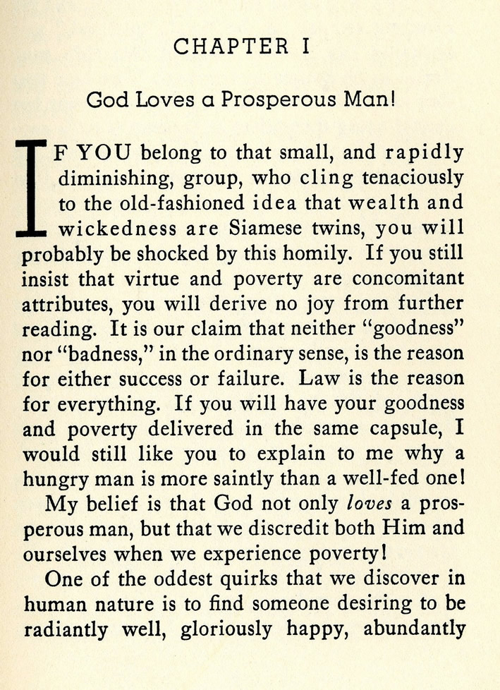 1F YOU belong to that small, and rapidly diminishing, group, who cling tenaciously to the old-fashioned idea that wealth and wickedness are Siamese twins, you will probably be shocked by this homily. If you still insist that virtue and poverty are concomitant attributes, you will derive no joy from further reading. It is our claim that neither "goodness" nor "badness," in the ordinary sense, is the reason for either success or failure. Law is the reason for everything. If you will have your goodness and poverty delivered in the same capsule, I would still like you to explain to me why a hungry man is more saintly than a well-fed one!