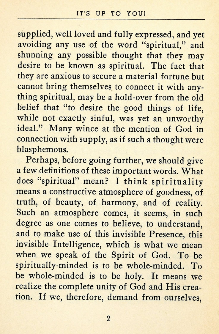 Perhaps, before going further, we should give a few definitions of these important words. What does "spiritual" mean? I think spirituality means a constructive atmosphere of goodness, of truth, of beauty, of harmony, and of reality. Such an atmosphere comes, it seems, in such degree as one comes to believe, to understand, and to make use of this invisible Presence, this invisible Intelligence, which is what we mean when we speak of the Spirit of God. To be spiritually-minded is to be whole-minded. To be whole-minded is to be holy. It means we realize the complete unity of God and His creation. If we, therefore, demand from ourselves,