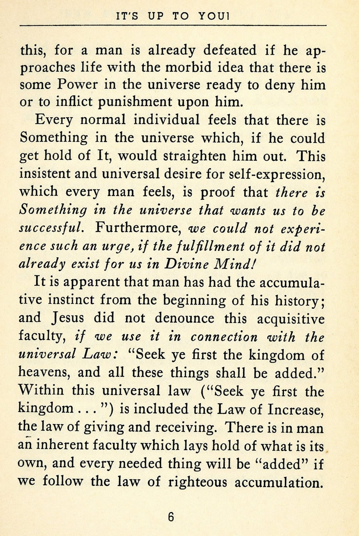 It is apparent that man has had the accumulative instinct from the beginning of his history; and Jesus did not denounce this acquisitive faculty, if we use it in connection with the universal Law: "Seek ye first the kingdom of heavens, and all these things shall be added." Within this universal law ("Seek ye first the kingdom . . . ") is included the Law of Increase, the law of giving and receiving. There is in man an inherent faculty which lays hold of what is its own, and every needed thing will be "added" if we follow the law of righteous accumulation.