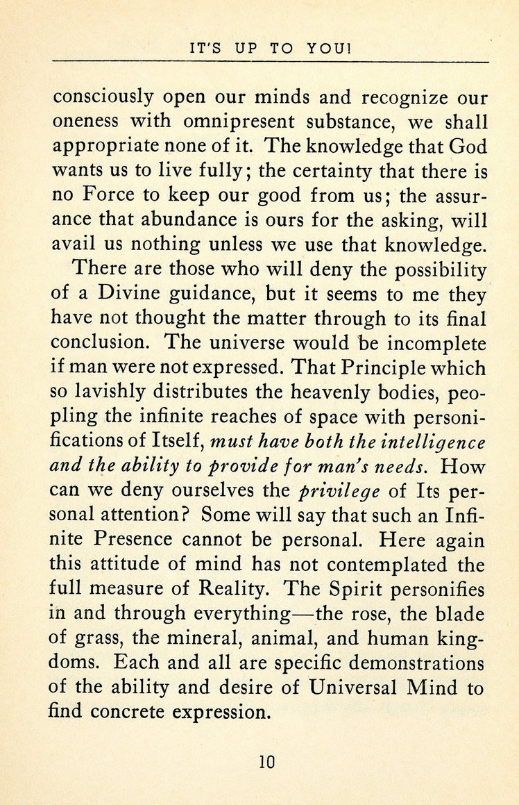 There are those who will deny the possibility of a Divine guidance, but it seems to me they have not thought the matter through to its final conclusion. The universe would be incomplete if man were not expressed. That Principle which so lavishly distributes the heavenly bodies, peopling the infinite reaches of space with personifications of Itself, must have both the intelligence and the ability to provide for man's needs. How can we deny ourselves the privilege of Its personal attention? Some will say that such an Infinite Presence cannot be personal. Here again this attitude of mind has not contemplated the full measure of Reality. The Spirit personifies in and through everything -- the rose, the blade of grass, the mineral, animal, and human kingdoms. Each and all are specific demonstrations of the ability and desire of Universal Mind to find concrete expression.