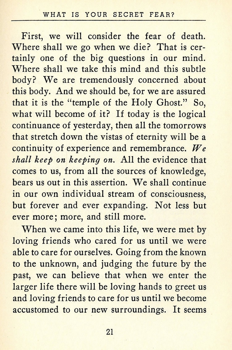 First, we will consider the fear of death. Where shall we go when we die? That is certainly one of the big questions in our mind. Where shall we take this mind and this subtle body? We are tremendously concerned about this body. And we should be, for we are assured that it is the "temple of the Holy Ghost." So, what will become of it? If today is the logical continuance of yesterday, then all the tomorrows that stretch down the vistas of eternity will be a continuity of experience and remembrance. We shall keep on keeping on. All the evidence that comes to us, from all the sources of knowledge, bears us out in this assertion. We shall continue in our own individual stream of consciousness, but forever and ever expanding. Not less but ever more; more, and still more.
