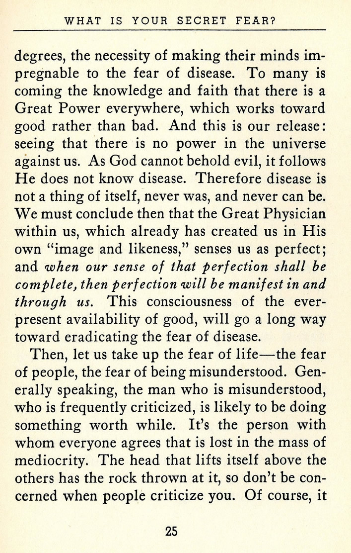 degrees, the necessity of making their minds impregnable to the fear of disease. To many is coming the knowledge and faith that there is a Great Power everywhere, which works toward good rather than bad. And this is our release: seeing that there is no power in the universe against us. As God cannot behold evil, it follows He does not know disease. Therefore disease is not a thing of itself, never was, and never can be. We must conclude then that the Great Physician within us, which already has created us in His own "image and likeness," senses us as perfect; and when our sense of that perfection shall be complete, then perfection will be manifest in and through us. This consciousness of the ever-present availability of good, will go a long way toward eradicating the fear of disease.