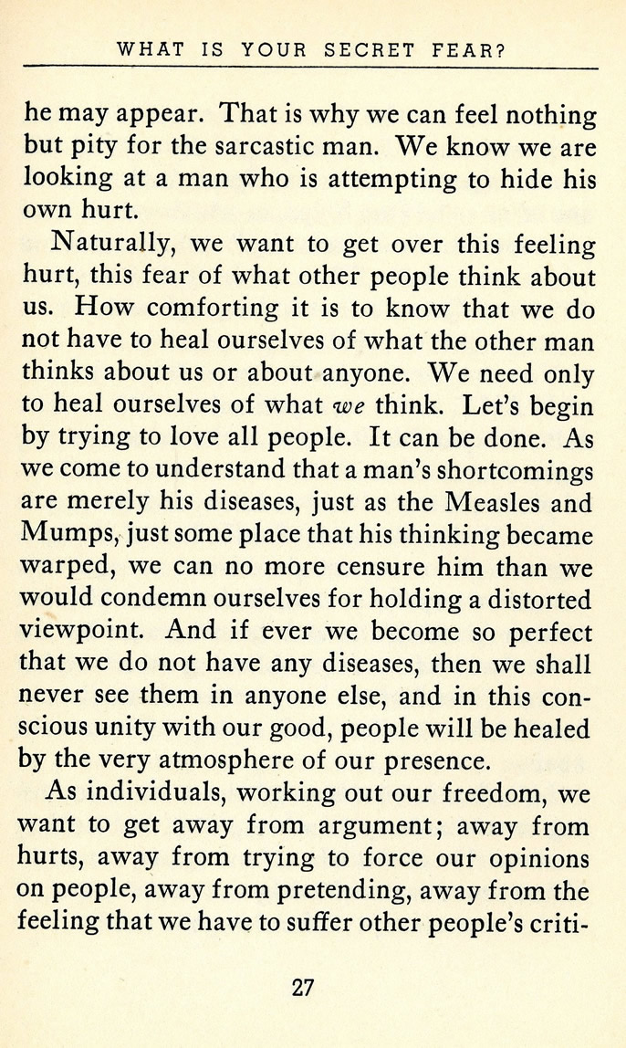 Naturally, we want to get over this feeling hurt, this fear of what other people think about us. How comforting it is to know that we do not have to heal ourselves of what the other man thinks about us or about anyone. We need only to heal ourselves of what we think. Let's begin by trying to love all people. It can be done. As we come to understand that a man's shortcomings are merely his diseases, just as the Measles and Mumps, just some place that his thinking became warped, we can no more censure him than we would condemn ourselves for holding a distorted viewpoint. And if ever we become so perfect that we do not have any diseases, then we shall never see them in anyone else, and in this conscious unity with our good, people will be healed by the very atmosphere of our presence.
