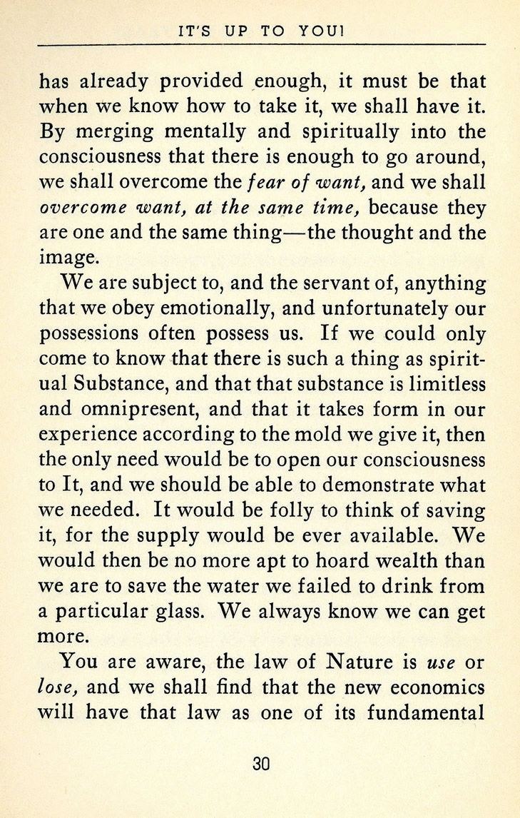 We are subject to, and the servant of, anything that we obey emotionally, and unfortunately our possessions often possess us. If we could only come to know that there is such a thing as spiritual Substance, and that that substance is limitless and omnipresent, and that it takes form in our experience according to the mold we give it, then the only need would be to open our consciousness to It, and we should be able to demonstrate what we needed. It would be folly to think of saving it, for the supply would be ever available. We would then be no more apt to hoard wealth than we are to save the water we failed to drink from a particular glass. We always know we can get more.
