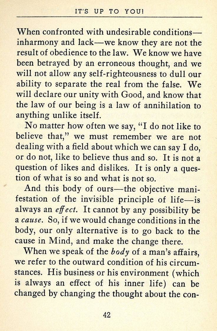 When confronted with undesirable conditions inharmony and lack -- we know they are not the result of obedience to the law. We know we have been betrayed by an erroneous thought, and we will not allow any self-righteousness to dull our ability to separate the real from the false. We will declare our unity with Good, and know that the law of our being is a law of annihilation to anything unlike itself.