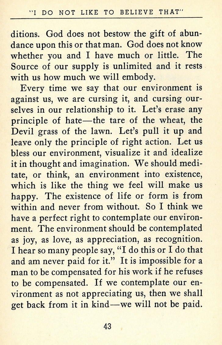 Every time we say that our environment is against us, we are cursing it, and cursing ourselves in our relationship to it. Let's erase any principle of hate -- the tare of the wheat, the Devil grass of the lawn. Let's pull it up and leave only the principle of right action. Let us bless our environment, visualize it and idealize it in thought and imagination. We should meditate, or think, an environment into existence, which is like the thing we feel will make us happy. The existence of life or form is from within and never from without. So I think we have a perfect right to contemplate our environment. The environment should be contemplated as joy, as love, as appreciation, as recognition. I hear so many people say, "I do this or I do that and am never paid for it." It is impossible for a man to be compensated for his work if he refuses to be compensated. If we contemplate our environment as not appreciating us, then we shall get back from it in kind -- we will not be paid.