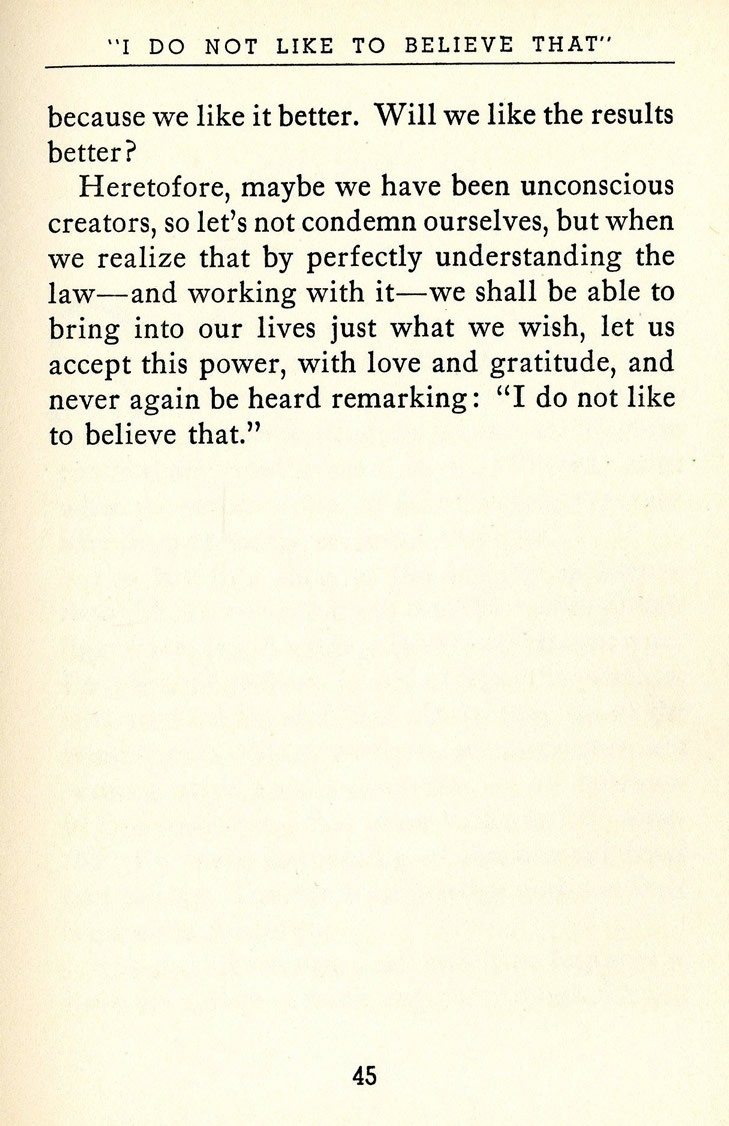 Heretofore, maybe we have been unconscious creators, so let's not condemn ourselves, but when we realize that by perfectly understanding the law -- and working with it -- we shall be able to bring into our lives just what we wish, let us accept this power, with love and gratitude, and never again be heard remarking: "I do not like to believe that."
