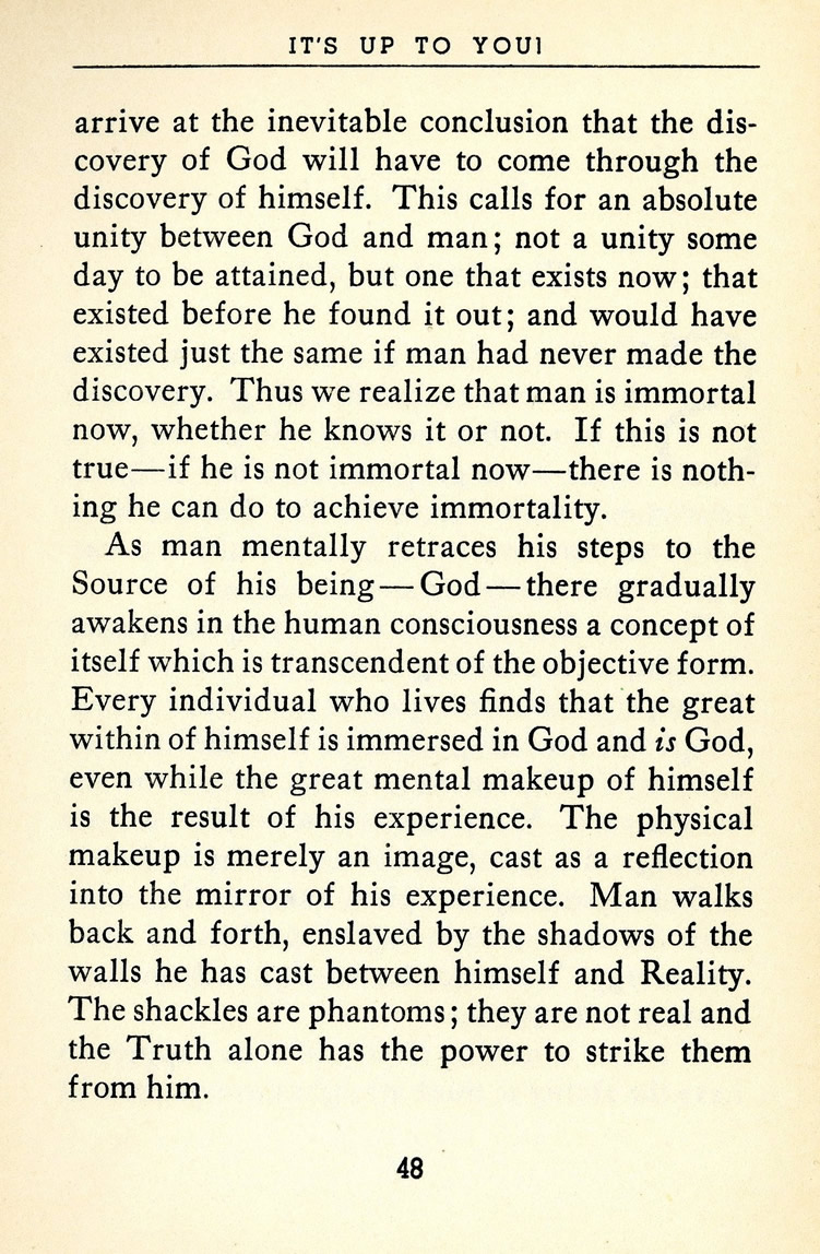 As man mentally retraces his steps to the Source of his being -- God -- there gradually awakens in the human consciousness a concept of itself which is transcendent of the objective form. Every individual who lives finds that the great within of himself is immersed in God and is God, even while the great mental makeup of himself is the result of his experience. The physical makeup is merely an image, cast as a reflection into the mirror of his experience. Man walks back and forth, enslaved by the shadows of the walls he has cast between himself and Reality. The shackles are phantoms; they are not real and the Truth alone has the power to strike them from him.