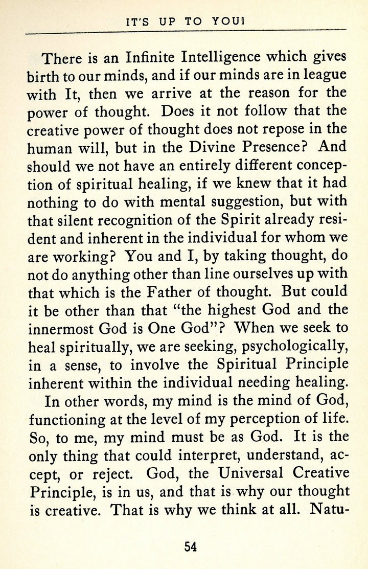 In other words, my mind is the mind of God, functioning at the level of my perception of life. So, to me, my mind must be as God. It is the only thing that could interpret, understand, accept, or reject. God, the Universal Creative Principle, is in us, and that is why our thought is creative. That is why we think at all. Naturally,