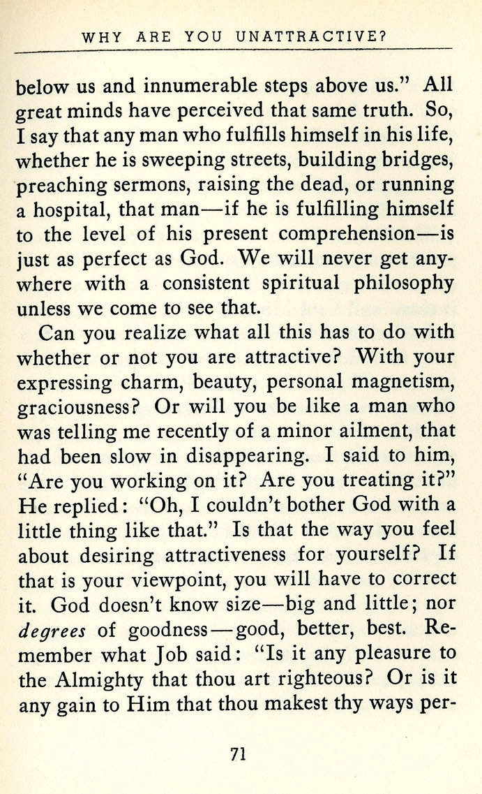 Can you realize what all this has to do with whether or not you are attractive? With your expressing charm, beauty, personal magnetism, graciousness? Or will you be like a man who was telling me recently of a minor ailment, that had been slow in disappearing. I said to him, "Are you working on it? Are you treating it?" He replied: "Oh, I couldn't bother God with a little thing like that." Is that the way you feel about desiring attractiveness for yourself? If that is your viewpoint, you will have to correct it. God doesn't know size -- big and little; nor degrees of goodness -- good, better, best. Remember what Job said: "Is it any pleasure to the Almighty that thou art righteous? Or is it any gain to Him that thou makest thy ways perfect?"