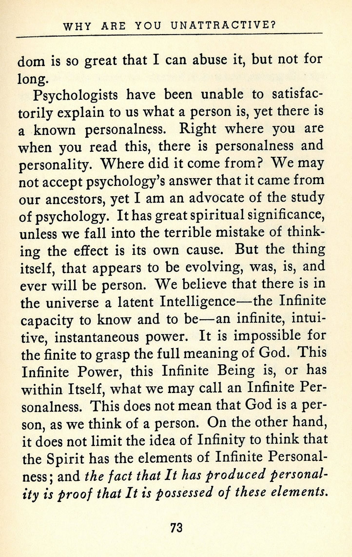 Psychologists have been unable to satisfactorily explain to us what a person is, yet there is a known personalness. Right where you are when you read this, there is personalness and personality. Where did it come from? We may not accept psychology's answer that it came from our ancestors, yet I am an advocate of the study of psychology. It has great spiritual significance, unless we fall into the terrible mistake of thinking the effect is its own cause. But the thing itself, that appears to be evolving, was, is, and ever will be person. We believe that there is in the universe a latent Intelligence -- the Infinite capacity to know and to be -- an infinite, intuitive, instantaneous power. It is impossible for the finite to grasp the full meaning of God. This Infinite Power, this Infinite Being is, or has within Itself, what we may call an Infinite Personalness. This does not mean that God is a person, as we think of a person. On the other hand, it does not limit the idea of Infinity to think that the Spirit has the elements of Infinite Personalness; and the fact that It has produced personality is proof that It is possessed of these elements.
