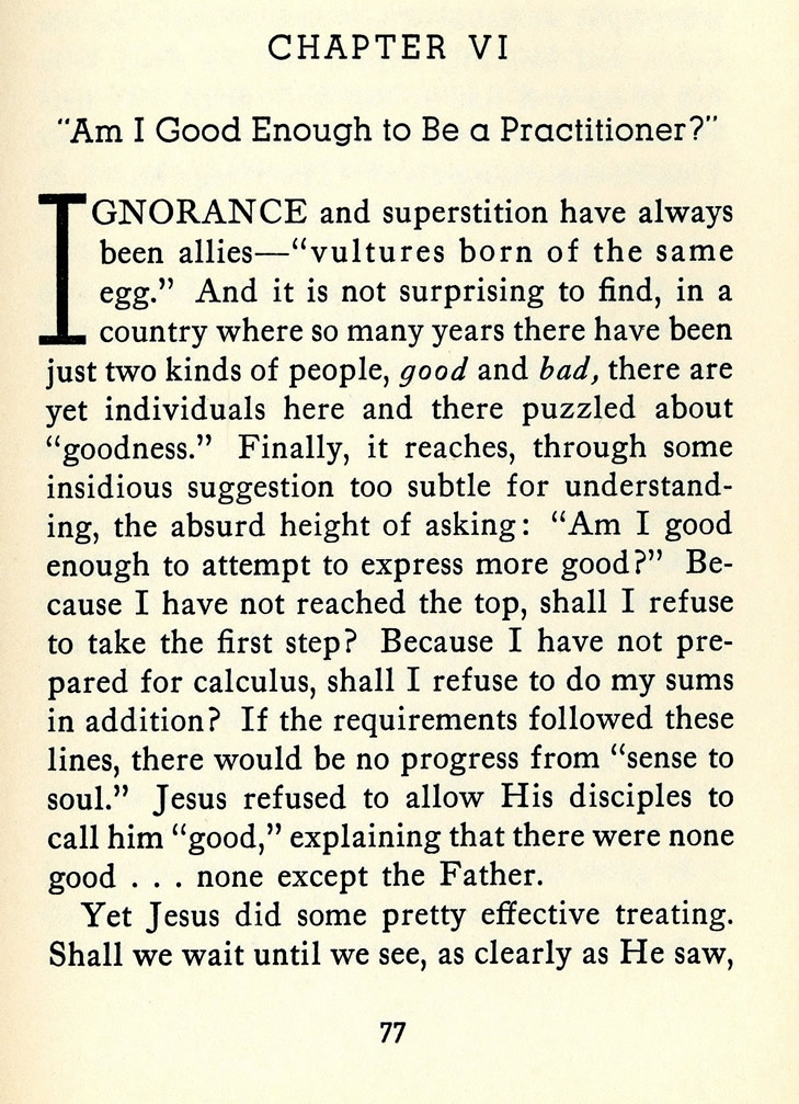 IGNORANCE and superstition have always been allies -- "vultures born of the same egg." And it is not surprising to find, in a country where so many years there have been just two kinds of people, good and bad, there are yet individuals here and there puzzled about "goodness." Finally, it reaches, through some insidious suggestion too subtle for understanding, the absurd height of asking: "Am I good enough to attempt to express more good?" Because I have not reached the top, shall I refuse to take the first step? Because I have not prepared for calculus, shall I refuse to do my sums in addition? If the requirements followed these lines, there would be no progress from "sense to soul." Jesus refused to allow His disciples to call him "good," explaining that there were none good . . . none except the Father.