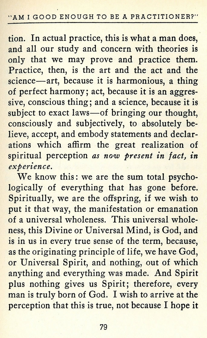 In actual practice, this is what a man does, and all our study and concern with theories is only that we may prove and practice them. Practice, then, is the art and the act and the science -- art, because it is harmonious, a thing of perfect harmony; act, because it is an aggressive, conscious thing; and a science, because it is subject to exact laws -- of bringing our thought, consciously and subjectively, to absolutely believe, accept, and embody statements and declarations which affirm the great realization of spiritual perception as now present in fact, in experience.