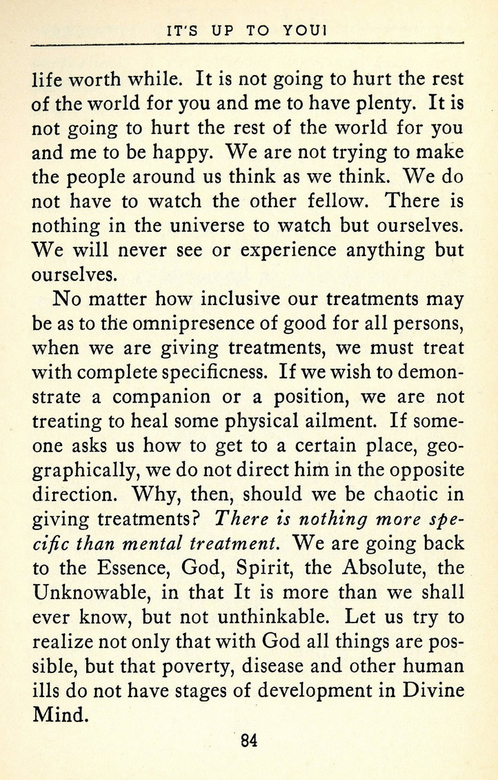 No matter how inclusive our treatments may be as to the omnipresence of good for all persons, when we are giving treatments, we must treat with complete specificness. If we wish to demonstrate a companion or a position, we are not treating to heal some physical ailment. If someone asks us how to get to a certain place, geographically, we do not direct him in the opposite direction. Why, then, should we be chaotic in giving treatments? There is nothing more specific than mental treatment. We are going back to the Essence, God, Spirit, the Absolute, the Unknowable, in that It is more than we shall ever know, but not unthinkable. Let us try to realize not only that with God all things are possible, but that poverty, disease and other human ills do not have stages of development in Divine Mind.