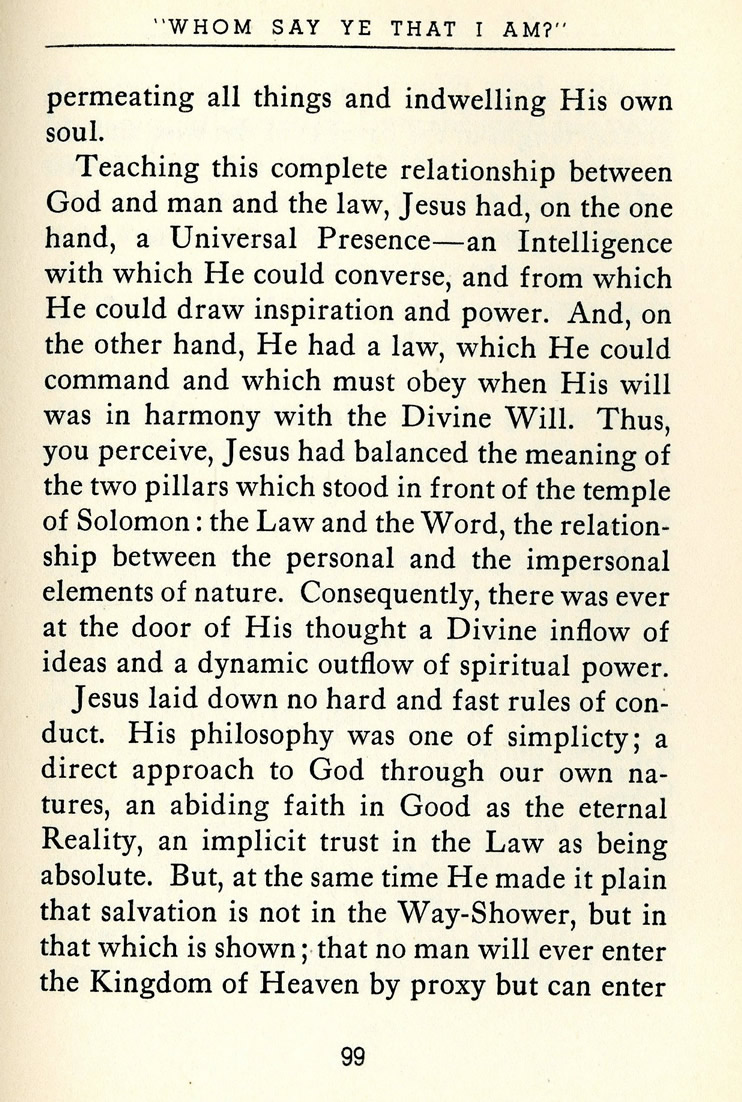 Jesus laid down no hard and fast rules of conduct. His philosophy was one of simplicity; a direct approach to God through our own natures, an abiding faith in Good as the eternal Reality, an implicit trust in the Law as being absolute. But, at the same time He made it plain that salvation is not in the Way-Shower, but in that which is shown; that no man will ever enter the Kingdom of Heaven by proxy but can enter