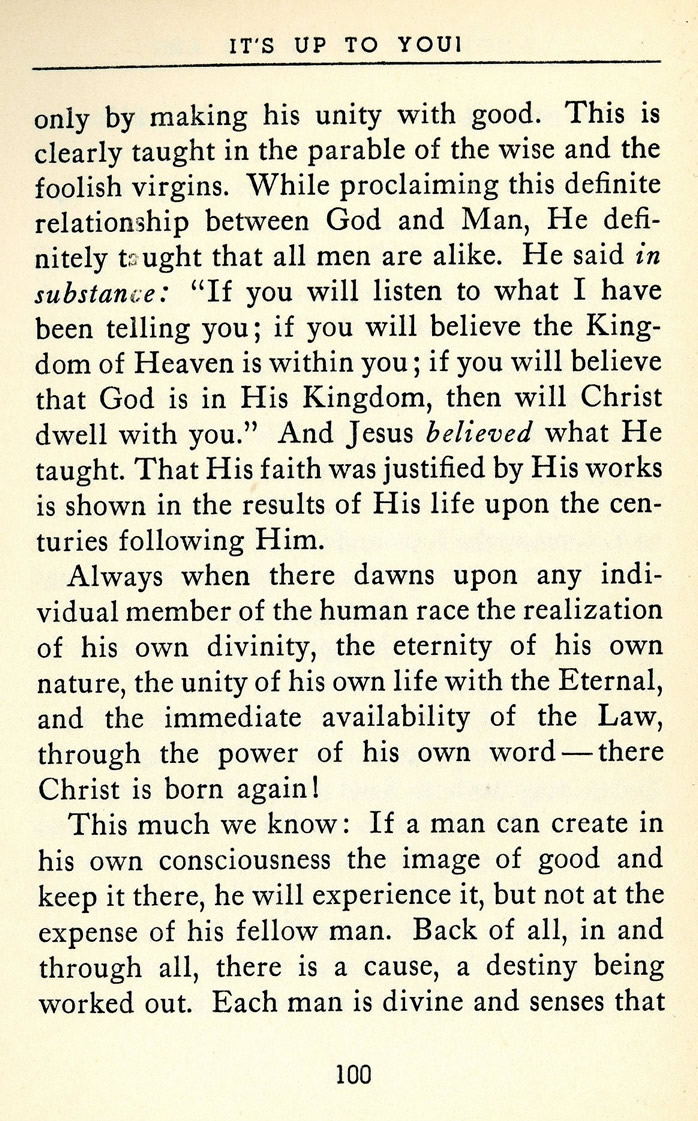 only by making his unity with good. This is clearly taught in the parable of the wise and the foolish virgins. While proclaiming this definite relationship between God and Man, He definitely thought that all men are alike. He said in substance: "If you will listen to what I have been telling you; if you will believe the Kingdom of Heaven is within you; if you will believe that God is in His Kingdom, then will Christ dwell with you." And Jesus believed what He taught. That His faith was justified by His works is shown in the results of His life upon the centuries following Him.