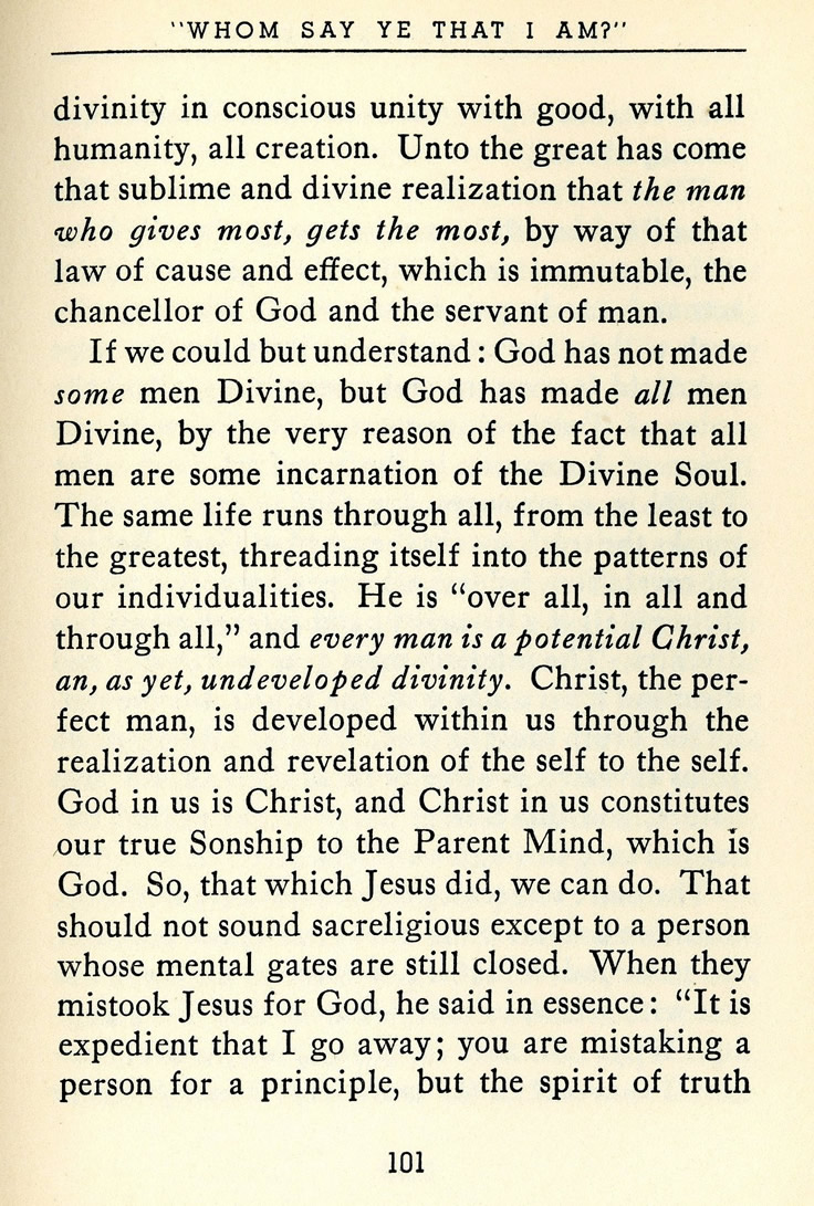If we could but understand: God has not made some men Divine, but God has made all men Divine, by the very reason of the fact that all men are some incarnation of the Divine Soul. The same life runs through all, from the least to the greatest, threading itself into the patterns of our individualities. He is "over all, in all and through all," and every man is a potential Christ, an, as yet, undeveloped divinity. Christ, the perfect man, is developed within us through the realization and revelation of the self to the self. God in us is Christ, and Christ in us constitutes our true Sonship to the Parent Mind, which is God. So, that which Jesus did, we can do. That should not sound sacrilegious except to a person whose mental gates are still closed. When they mistook Jesus for God, he said in essence: "It is expedient that I go away; you are mistaking a person for a principle, but the spirit of truth