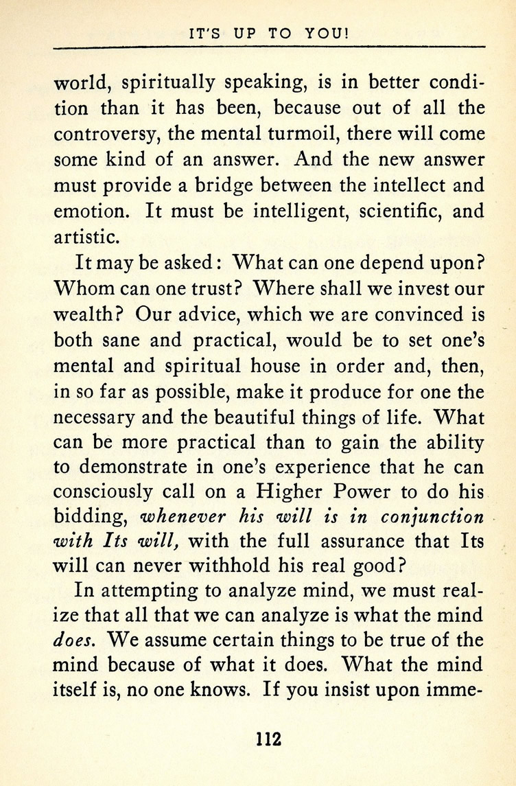 It may be asked: What can one depend upon? Whom can one trust? Where shall we invest our wealth? Our advice, which we are convinced is both sane and practical, would be to set one's mental and spiritual house in order and, then, in so far as possible, make it produce for one the necessary and the beautiful things of life. What can be more practical than to gain the ability to demonstrate in one's experience that he can consciously call on a Higher Power to do his bidding, whenever his will is in conjunction with Its will, with the full assurance that Its will can never withhold his real good?