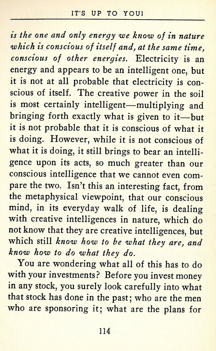 is the one and only energy we know of in nature which is conscious of itself and, at the same time, conscious of other energies. Electricity is an energy and appears to be an intelligent one, but it is not at all probable that electricity is conscious of itself. The creative power in the soil is most certainly intelligent -- multiplying and bringing forth exactly what is given to it -- but it is not probable that it is conscious of what it is doing. However, while it is not conscious of what it is doing, it still brings to bear an intelligence upon its acts, so much greater than our conscious intelligence that we cannot even compare the two. Isn't this an interesting fact, from the metaphysical viewpoint, that our conscious mind, in its everyday walk of life, is dealing with creative intelligences in nature, which do not know that they are creative intelligences, but which still know how to be what they are, and know how to do what they do.