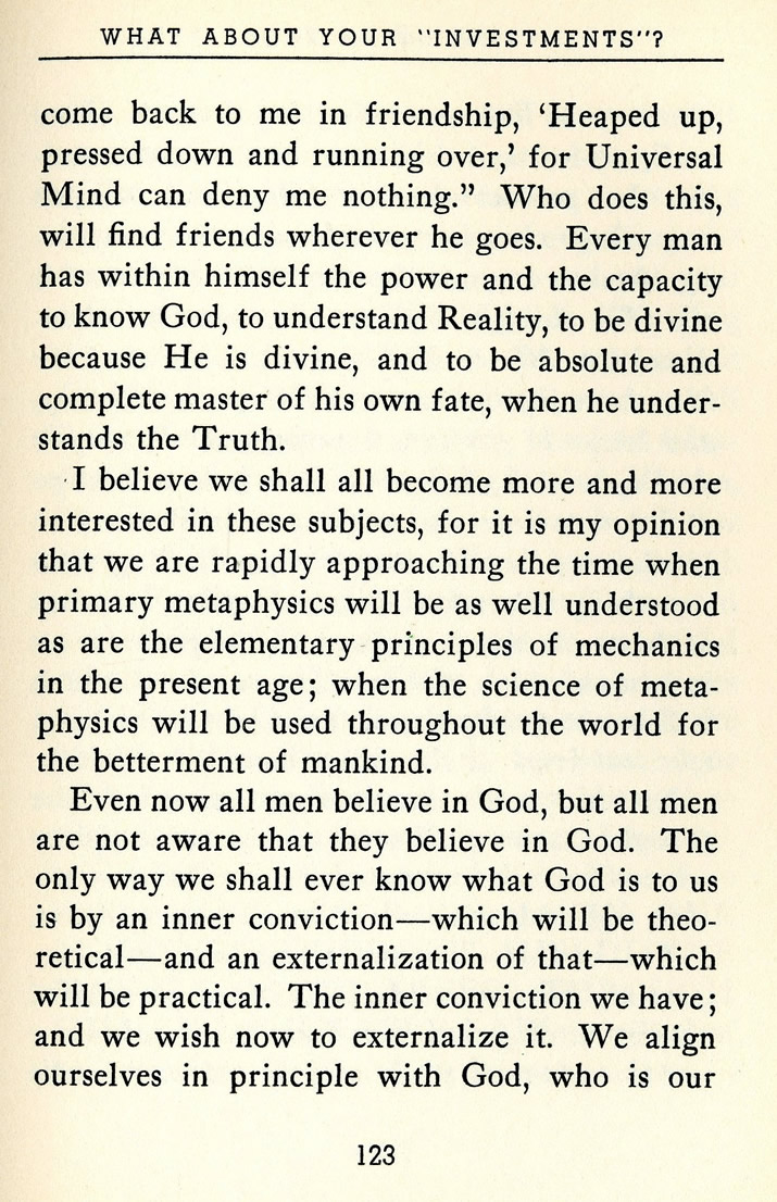 I believe we shall all become more and more interested in these subjects, for it is my opinion that we are rapidly approaching the time when primary metaphysics will be as well understood as are the elementary principles of mechanics in the present age; when the science of metaphysics will be used throughout the world for the betterment of mankind.