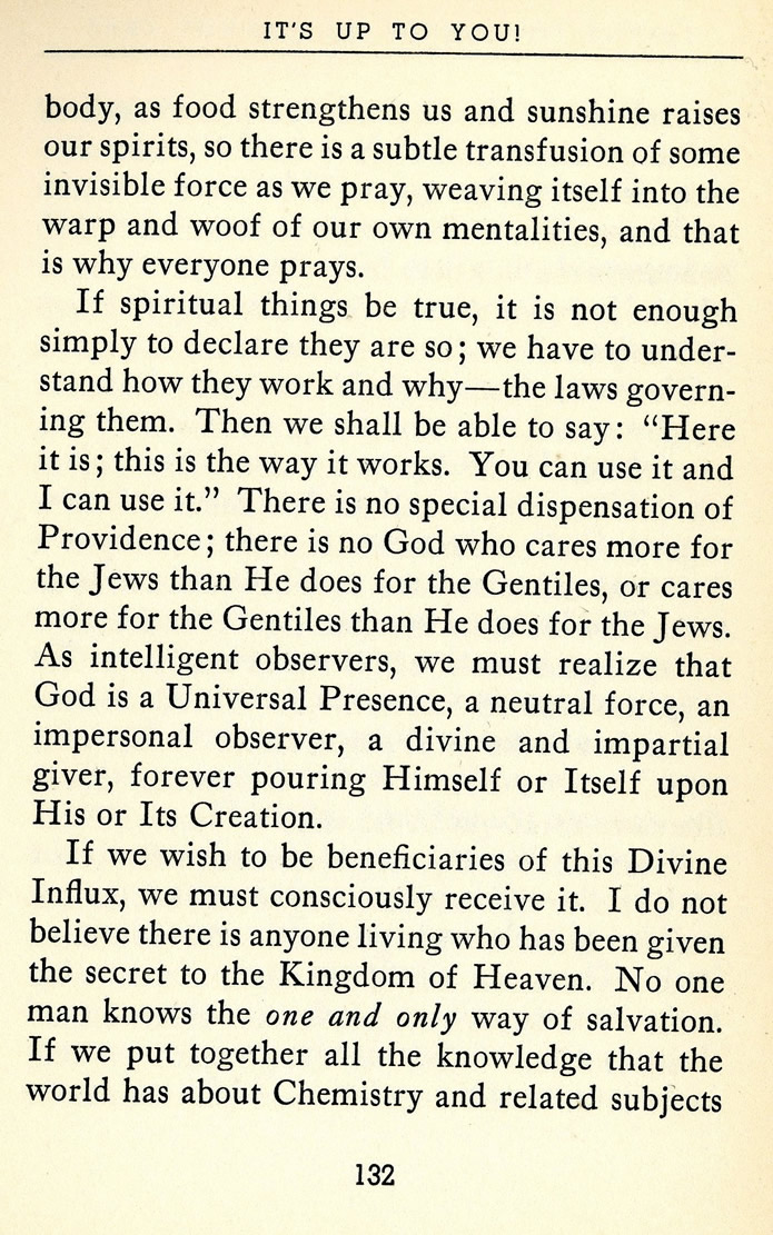 If spiritual things be true, it is not enough simply to declare they are so; we have to understand how they work and why -- the laws governing them. Then we shall be able to say: "Here it is; this is the way it works. You can use it and I can use it." There is no special dispensation of Providence; there is no God who cares more for the Jews than He does for the Gentiles, or cares more for the Gentiles than He does for the Jews. As intelligent observers, we must realize that God is a Universal Presence, a neutral force, an impersonal observer, a divine and impartial giver, forever pouring Himself or Itself upon His or Its Creation.