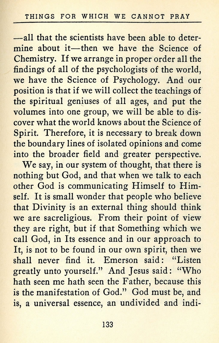 -- all that the scientists have been able to determine about it -- then we have the Science of Chemistry. If we arrange in proper order all the findings of all of the psychologists of the world, we have the Science of Psychology. And our position is that if we will collect the teachings of the spiritual geniuses of all ages, and put the volumes into one group, we will be able to discover what the world knows about the Science of Spirit. Therefore, it is necessary to break down the boundary lines of isolated opinions and come into the broader field and greater perspective.