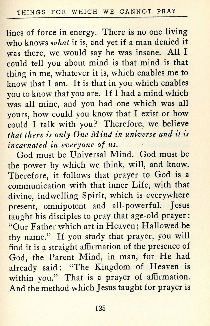 God must be Universal Mind. God must be the power by which we think, will, and know. Therefore, it follows that prayer to God is a communication with that inner Life, with that divine, indwelling Spirit, which is everywhere present, omnipotent and all-powerful. Jesus taught his disciples to pray that age-old prayer: "Our Father which art in Heaven; Hallowed be thy name." If you study that prayer, you will find it is a straight affirmation of the presence of God, the Parent Mind, in man, for He had already said: "The Kingdom of Heaven is within you." That is a prayer of affirmation. And the method which Jesus taught for prayer is