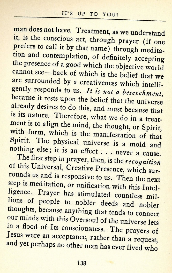 man does not have. Treatment, as we understand it, is the conscious act, through prayer (if one prefers to call it by that name) through meditation and contemplation, of definitely accepting the presence of a good which the objective world cannot see -- back of which is the belief that we are surrounded by a creativeness which intelligently responds to us. It is not a beseechment, because it rests upon the belief that the universe already desires to do this, and must because that is its nature. Therefore, what we do in a treatment is to align the mind, the thought, or Spirit, with form, which is the manifestation of that Spirit. The physical universe is a mold and nothing else; it is an effect . . . never a cause.