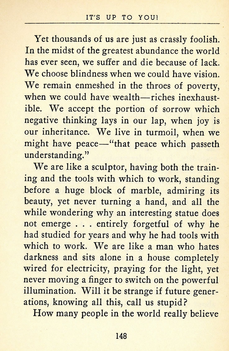 Yet thousands of us are just as crassly foolish. In the midst of the greatest abundance the world has ever seen, we suffer and die because of lack. We choose blindness when we could have vision. We remain enmeshed in the throes of poverty, when we could have wealth -- riches inexhaustible. We accept the portion of sorrow which negative thinking lays in our lap, when joy is our inheritance. We live in turmoil, when we might have peace -- "that peace which passeth understanding."