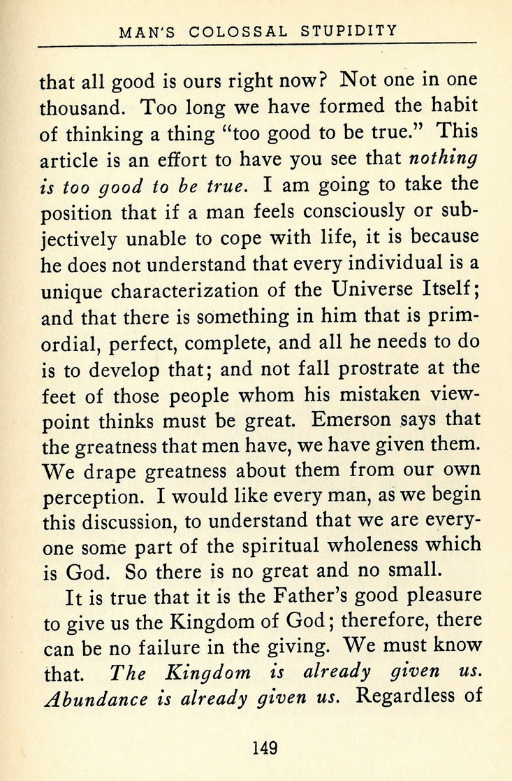 that all good is ours right now? Not one in one thousand. Too long we have formed the habit of thinking a thing "too good to be true." This article is an effort to have you see that nothing is too good to be true. I am going to take the position that if a man feels consciously or subjectively unable to cope with life, it is because he does not understand that every individual is a unique characterization of the Universe Itself; and that there is something in him that is primordial, perfect, complete, and all he needs to do is to develop that; and not fall prostrate at the feet of those people whom his mistaken viewpoint thinks must be great. Emerson says that the greatness that men have, we have given them. We drape greatness about them from our own perception. I would like every man, as we begin this discussion, to understand that we are everyone some part of the spiritual wholeness which is God. So there is no great and no small.