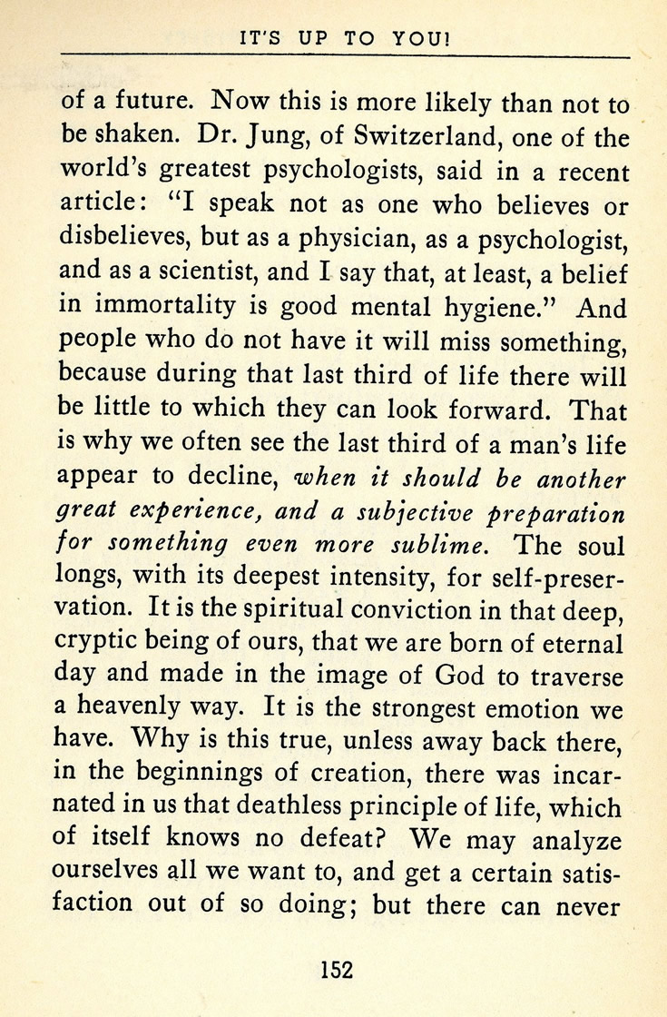 of a future. Now this is more likely than not to be shaken. Dr. Jung, of Switzerland, one of the world's greatest psychologists, said in a recent article: "I speak not as one who believes or disbelieves, but as a physician, as a psychologist, and as a scientist, and I say that, at least, a belief in immortality is good mental hygiene." And people who do not have it will miss something, because during that last third of life there will be little to which they can look forward. That is why we often see the last third of a man's life appear to decline, when it should be another great experience, and a subjective preparation for something even more sublime. The soul longs, with its deepest intensity, for self-preservation. It is the spiritual conviction in that deep, cryptic being of ours, that we are born of eternal day and made in the image of God to traverse a heavenly way. It is the strongest emotion we have. Why is this true, unless away back there, in the beginnings of creation, there was incarnated in us that deathless principle of life, which of itself knows no defeat? We may analyze ourselves all we want to, and get a certain satisfaction out of so doing; but there can never