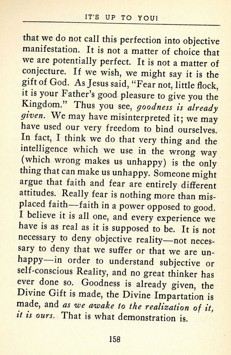 that we do not call this perfection into objective manifestation. It is not a matter of choice that we are potentially perfect. It is not a matter of conjecture. If we wish, we might say it is the gift of God. As Jesus said, "Fear not, little flock, it is your Father's good pleasure to give you the Kingdom." Thus you see, goodness is already given. We may have misinterpreted it; we may have used our very freedom to bind ourselves. In fact, I think we do that very thing and the intelligence which we use in the wrong way (which wrong makes us unhappy) is the only thing that can make us unhappy. Someone might argue that faith and fear are entirely different attitudes. Really fear is nothing more than misplaced faith -- faith in a power opposed to good. I believe it is all one, and every experience we have is as real as it is supposed to be. It is not necessary to deny objective reality -- not necessary to deny that we suffer or that we are unhappy -- in order to understand subjective or self-conscious Reality, and no great thinker has ever done so. Goodness is already given, the Divine Gift is made, the Divine Impartation is made, and as we awake to the realization of it, it is ours. That is what demonstration is.