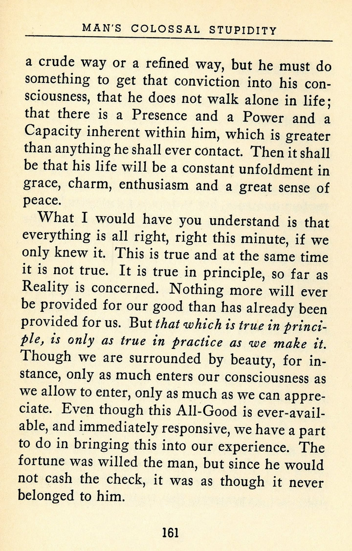 But that which is true in principle, is only as true in practice as we make it. Though we are surrounded by beauty, for instance, only as much enters our consciousness as we allow to enter, only as much as we can appreciate. Even though this All-Good is ever-available, and immediately responsive, we have a part to do in bringing this into our experience. The fortune was willed the man, but since he would not cash the check, it was as though it never belonged to him.