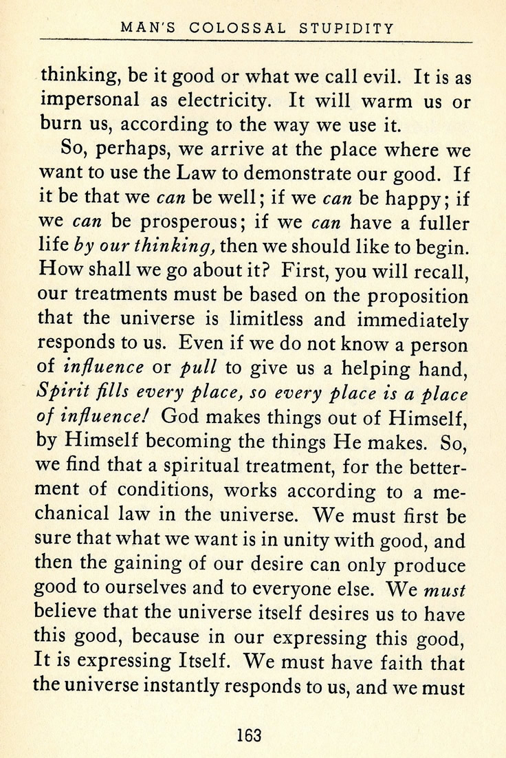 So, perhaps, we arrive at the place where we want to use the Law to demonstrate our good. If it be that we can be well; if we can be happy; if we can be prosperous; if we can have a fuller life by our thinking, then we should like to begin. How shall we go about it? First, you will recall, our treatments must be based on the proposition that the universe is limitless and immediately responds to us. Even if we do not know a person of influence or pull to give us a helping hand, Spirit fills every place, so every place is a place of influence! God makes things out of Himself, by Himself becoming the things He makes. So, we find that a spiritual treatment, for the betterment of conditions, works according to a mechanical law in the universe. We must first be sure that what we want is in unity with good, and then the gaining of our desire can only produce good to ourselves and to everyone else.* We must believe that the universe itself desires us to have this good, because in our expressing this good, It is expressing Itself. We must have faith that the universe instantly responds to us, and we must