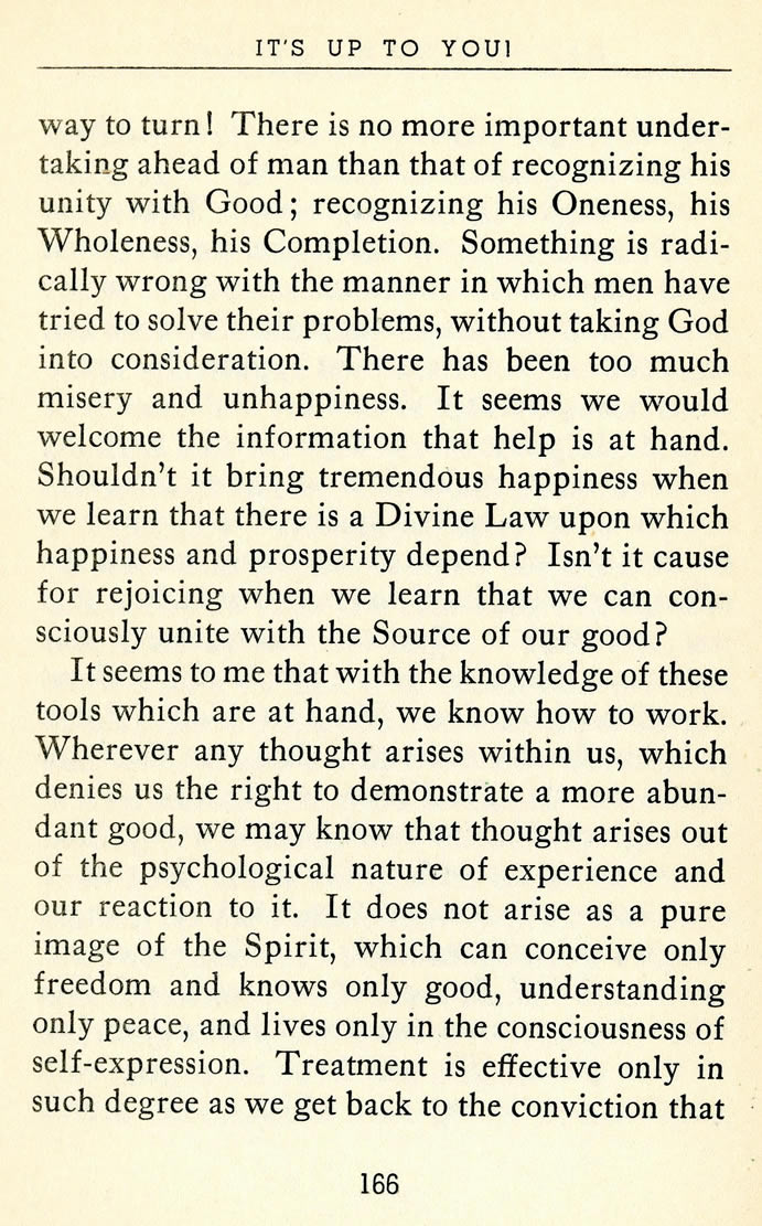 way to turn! There is no more important undertaking ahead of man than that of recognizing his unity with Good; recognizing his Oneness, his Wholeness, his Completion. Something is radically wrong with the manner in which men have tried to solve their problems, without taking God into consideration. There has been too much misery and unhappiness. It seems we would welcome the information that help is at hand. Shouldn't it bring tremendous happiness when we learn that there is a Divine Law upon which happiness and prosperity depend? Isn't it cause for rejoicing when we learn that we can con-sciously unite with the Source of our good?