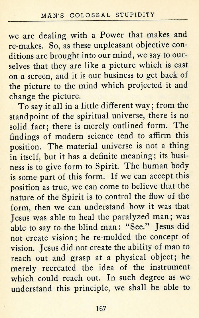 To say it all in a little different way; from the standpoint of the spiritual universe, there is no solid fact; there is merely outlined form. The findings of modern science tend to affirm this position. The material universe is not a thing in itself, but it has a definite meaning; its business is to give form to Spirit. The human body is some part of this form. If we can accept this position as true, we can come to believe that the nature of the Spirit is to control the flow of the form, then we can understand how it was that Jesus was able to heal the paralyzed man; was able to say to the blind man: "See." Jesus did not create vision; he re-molded the concept of vision. Jesus did not create the ability of man to reach out and grasp at a physical object; he merely recreated the idea of the instrument which could reach out. In such degree as we understand this principle, we shall be able to