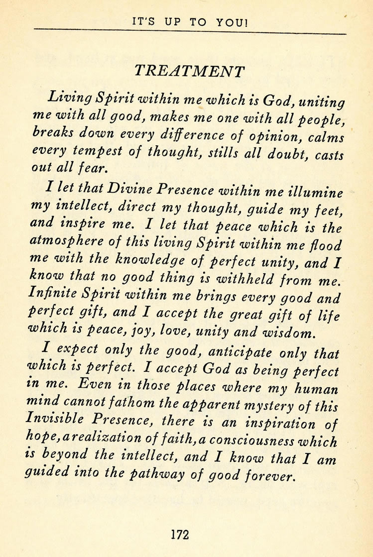 Living Spirit within me which is God, uniting me with all good, makes me one with all people, breaks down every difference of opinion, calms every tempest of thought, stills all doubt, casts out all fear.