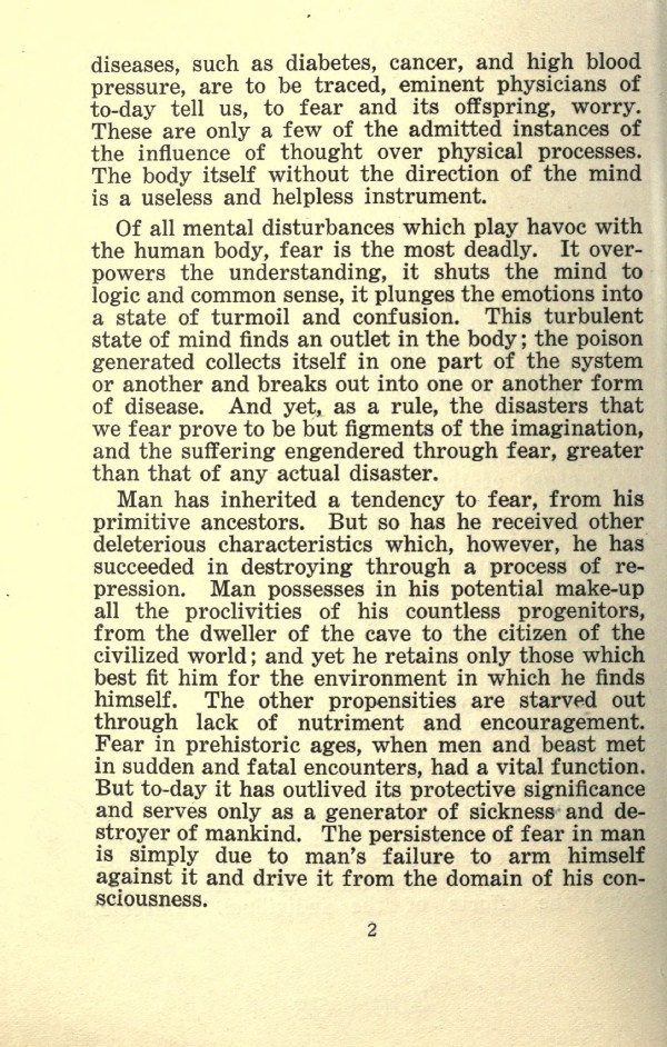 Of all mental disturbances which play havoc with the human body, fear is the most deadly. It overpowers the understanding, it shuts the mind to logic and common sense, it plunges the emotions into a state of turmoil and confusion. This turbulent state of mind finds an outlet in the body; the poison generated collects itself in one part of the system or another and breaks out into one or another form of disease. And yet, as a rule, the disasters that we fear prove to be but figments of the imagination, and the suffering engendered through fear, greater than that of any actual disaster.
