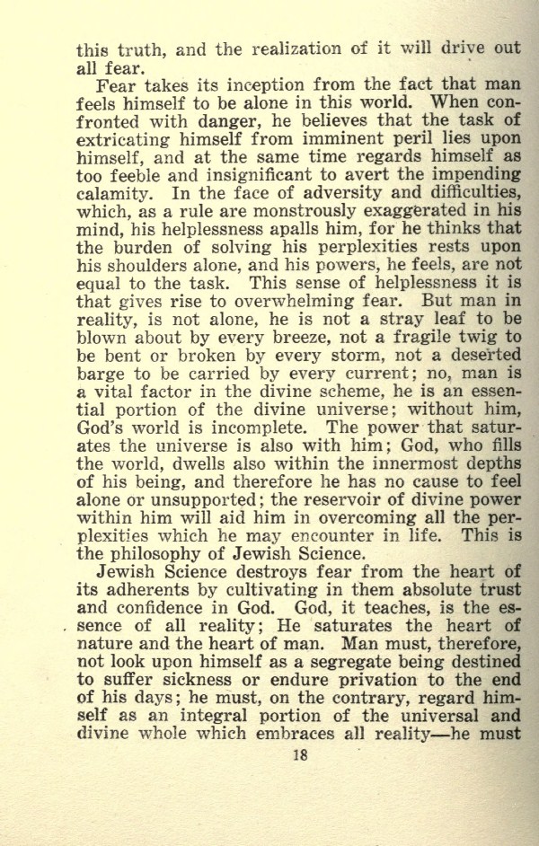 Fear takes its inception from the fact that man feels himself to be alone in this world. When confronted with danger, he believes that the task of extricating himself from imminent peril lies upon himself, and at the same time regards himself as too feeble and insignificant to avert the impending calamity. In the face of adversity and difficulties, which, as a rule are monstrously exaggerated in his mind, his helplessness appalls him, for he thinks that the burden of solving his perplexities rests upon his shoulders alone, and his powers, he feels, are not equal to the task. This sense of helplessness it is that gives rise to overwhelming fear. But man in reality, is not alone, he is not a stray leaf to be blown about by every breeze, not a fragile twig to be bent or broken by every storm, not a deserted barge to be carried by every current; no, man is a vital factor in the divine scheme, he is an essential portion of the divine universe; without him, God's world is incomplete. The power that saturates the universe is also with him; God, who fills the world, dwells also within the innermost depths of his being, and therefore he has no cause to feel alone or unsupported; the reservoir of divine power within him will aid him in overcoming all the perplexities which he may encounter in life. This is the philosophy of Jewish Science.