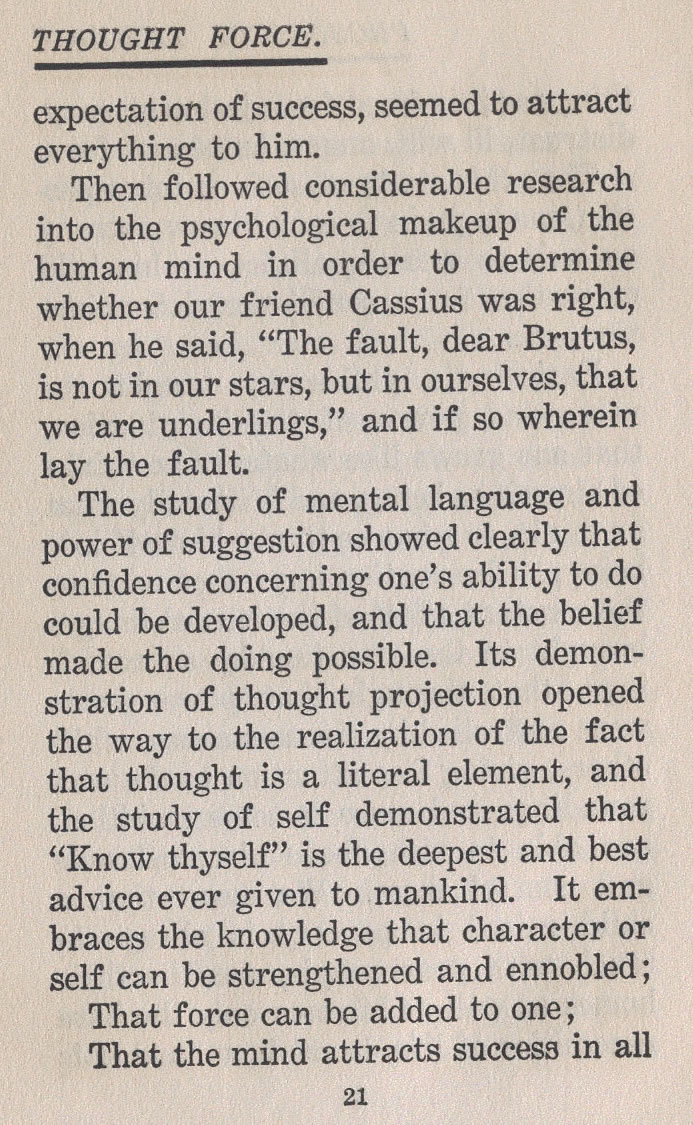 Then followed considerable research into the psychological makeup of the human mind in order to determine whether our friend Cassius was right, when he said, "The fault, dear Brutus, is not in our stars, but in ourselves, that we are underlings," and if so wherein lay the fault.