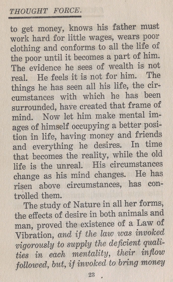 The study of Nature in all her forms, the effects of desire in both animals and man, proved the existence of a Law of Vibration, and if the law was invoked vigorously to supply the deficient qualities in each mentality, their inflow followed, but, if invoked to bring money