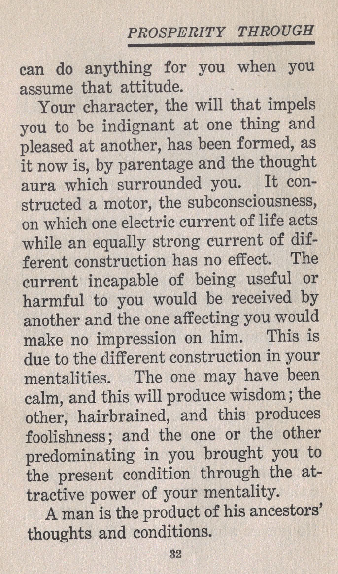 Your character, the will that impels you to be indignant at one thing and pleased at another, has been formed, as it now is, by parentage and the thought aura which surrounded you. It constructed a motor, the subconsciousness, on which one electric current of life acts while an equally strong current of different construction has no effect. The current incapable of being useful or harmful to you would be received by another and the one affecting you would make no impression on him. This is due to the different construction in your mentalities. The one may have been calm, and this will produce wisdom; the other, hairbrained, and this produces foolishness; and the one or the other predominating in you brought you to the present condition through the attractive power of your mentality.