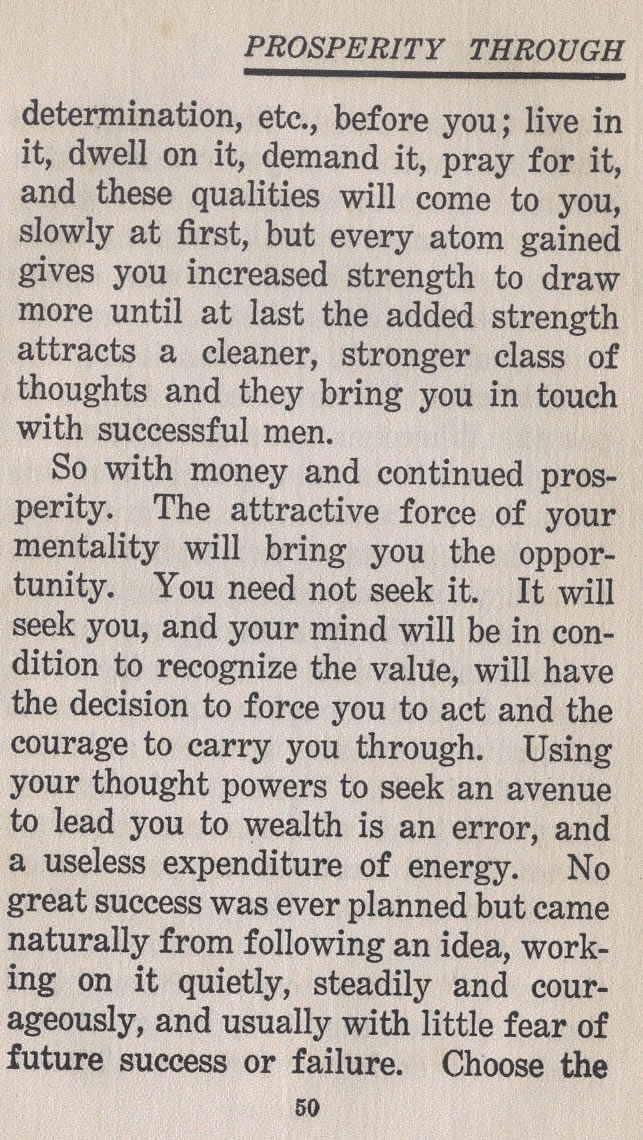 So with money and continued prosperity. The attractive force of your mentality will bring you the opportunity. You need not seek it. It will seek you, and your mind will be in condition to recognize the value, will have the decision to force you to act and the courage to carry you through. Using your thought powers to seek an avenue to lead you to wealth is an error, and a useless expenditure of energy. No great success was ever planned but came naturally from following an idea, working on it quietly, steadily and courageously, and usually with little fear of future success or failure. Choose the