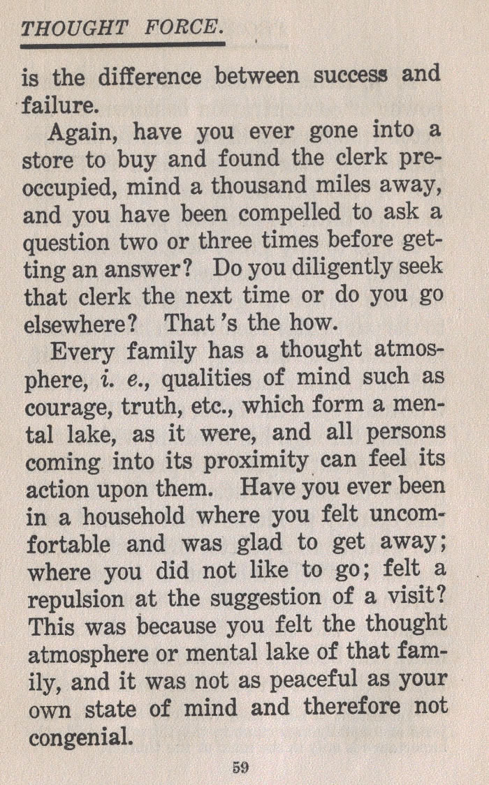 Every family has a thought atmosphere, i. e., qualities of mind such as courage, truth, etc., which form a mental lake, as it were, and all persons coming into its proximity can feel its action upon them. Have you ever been in a household where you felt uncomfortable and was glad to get away; where you did not like to go; felt a repulsion at the suggestion of a visit? This was because you felt the thought atmosphere or mental lake of that family, and it was not as peaceful as your own state of mind and therefore not congenial.