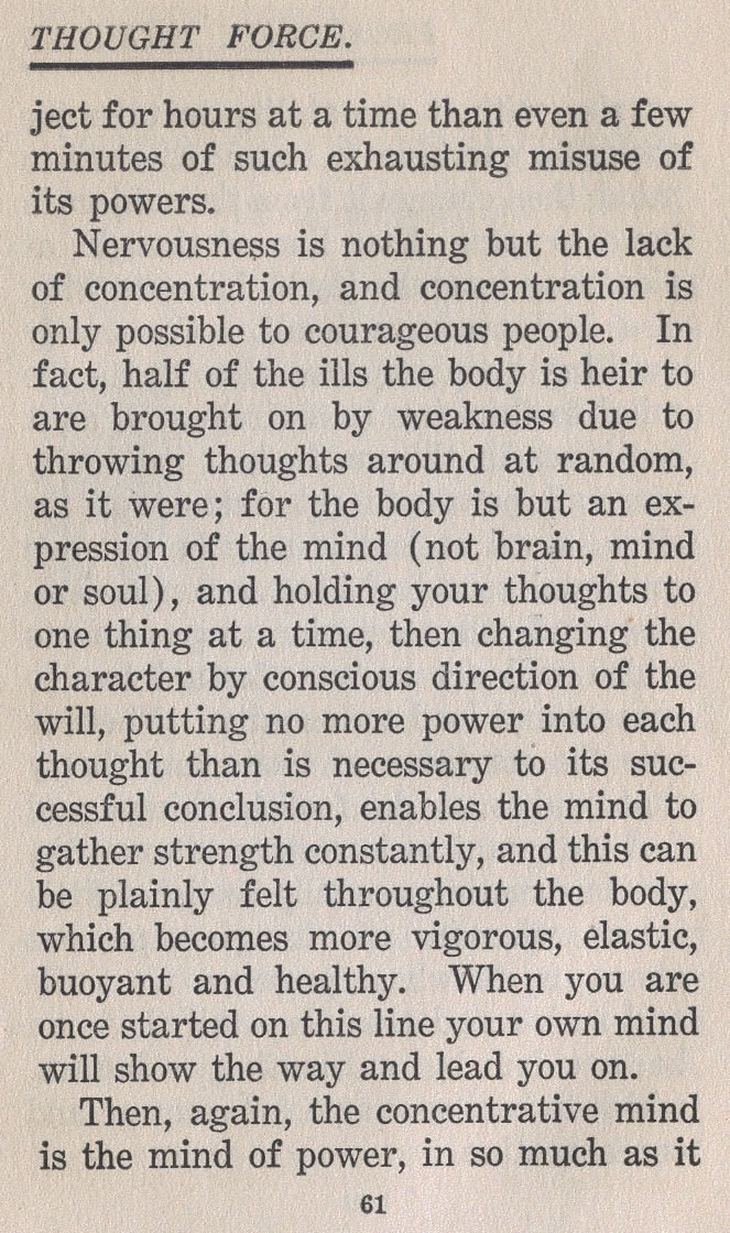 Nervousness is nothing but the lack of concentration, and concentration is only possible to courageous people. In fact, half of the ills the body is heir to are brought on by weakness due to throwing thoughts around at random, as it were; for the body is but an expression of the mind (not brain, mind or soul), and holding your thoughts to one thing at a time, then changing the character by conscious direction of the will, putting no more power into each thought than is necessary to its successful conclusion, enables the mind to gather strength constantly, and this can be plainly felt throughout the body, which becomes more vigorous, elastic, buoyant and healthy. When you are once started on this line your own mind will show the way and lead you on.