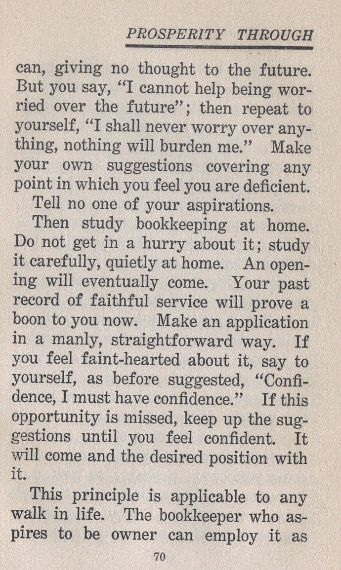 can, giving no thought to the future. But you say, "I cannot help being worried over the future"; then repeat to yourself, "I shall never worry over anything, nothing will burden me." Make your own suggestions covering any point in which you feel you are deficient.