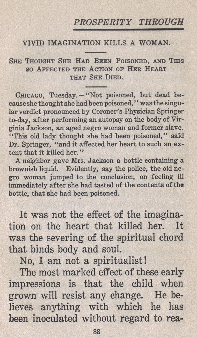 CHICAGO, Tuesday. --- "Not poisoned, but dead because she thought she had been poisoned," was the singular verdict pronounced by Coroner's Physician Springer to-day, after performing an autopsy on the body of Virginia Jackson, an aged negro woman and former slave. "This old lady thought she had been poisoned," said Dr. Springer, "and it affected her heart to such an extent that it killed her."